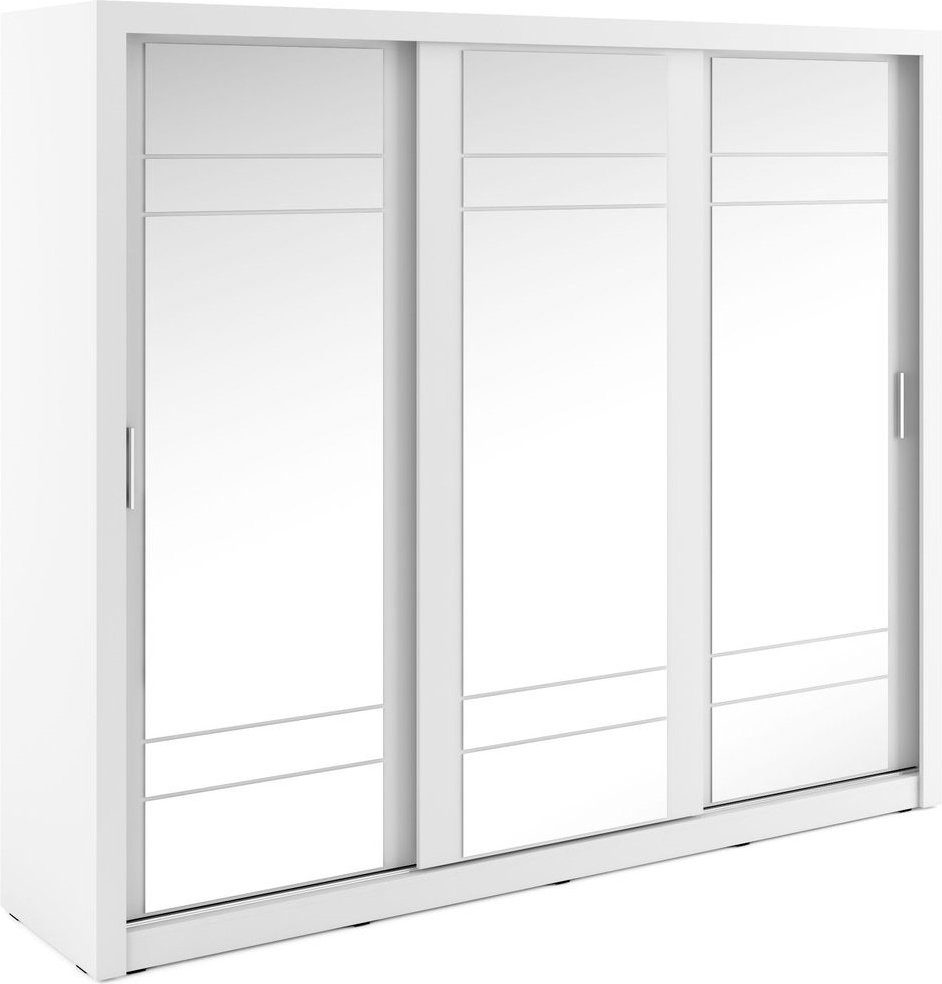 En fin og romslig garderobe med moderne design. Produsert i Chipboard og med mange oppbevaringsmuligheter. Bak de tre skyvedørene med speil, finner du masse rom, klesstang og hylleplan.