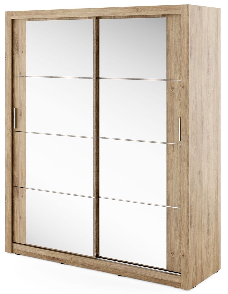 En fin og romslig garderobe med moderne design. Produsert i Chipboard og med mange oppbevaringsmuligheter. Bak de to skyvedørene med speil, finner du mye rom, klesstang og hylleplan.