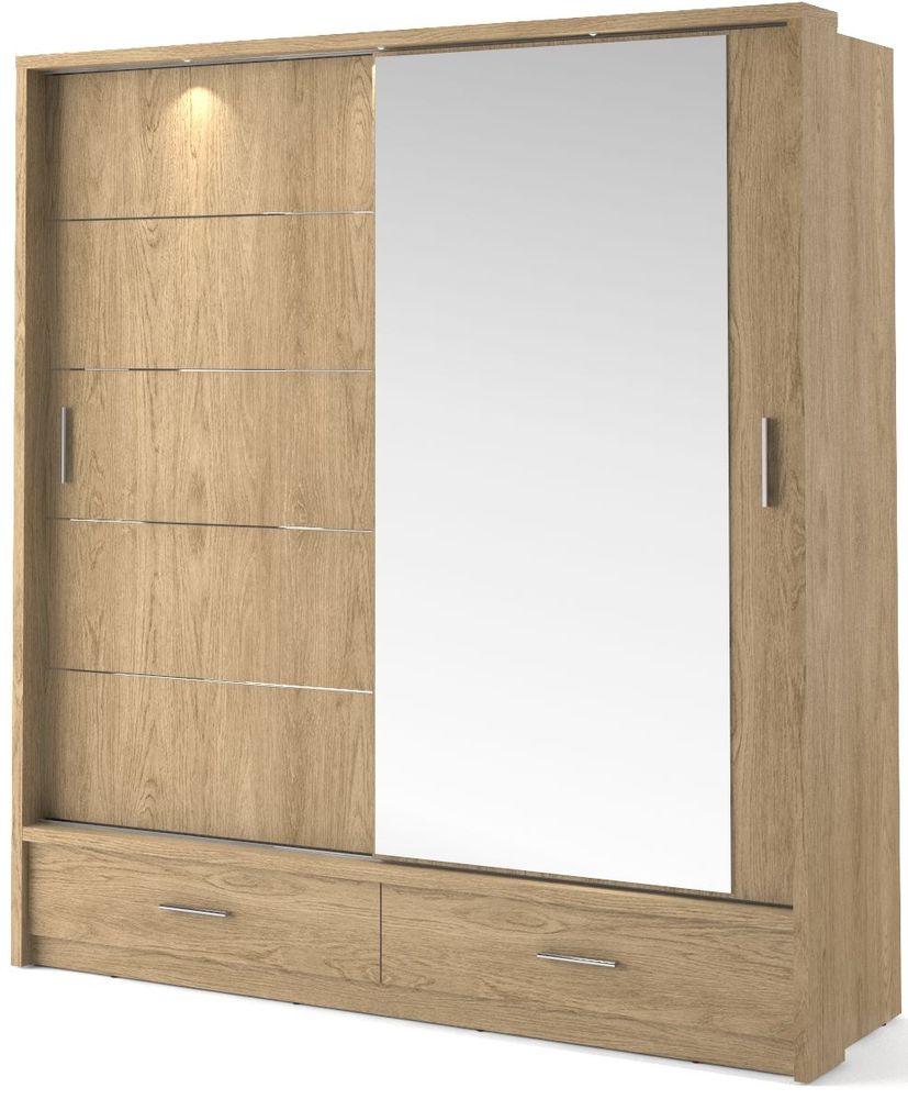 En fin og romslig garderobe med moderne design. Produsert i Chipboard og med mange oppbevaringsmuligheter. Bak de to skyvedørene, hvorav en med speil, finner du mye rom, klesstang og hylleplan. Nederst finnes også to skuffer for smart oppbevaring.