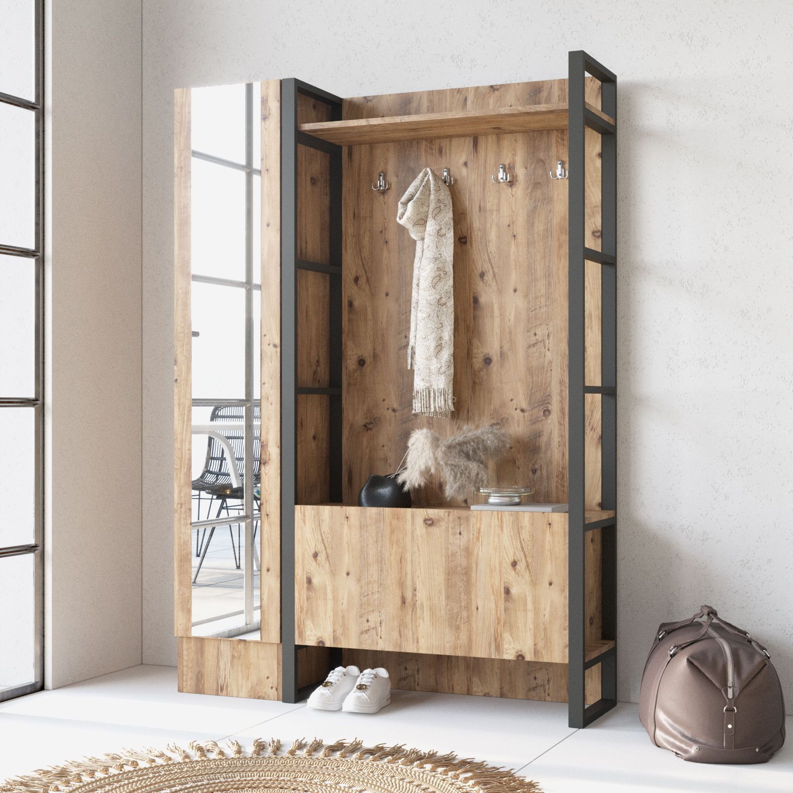 Gangmøbel laget av tre og metall.