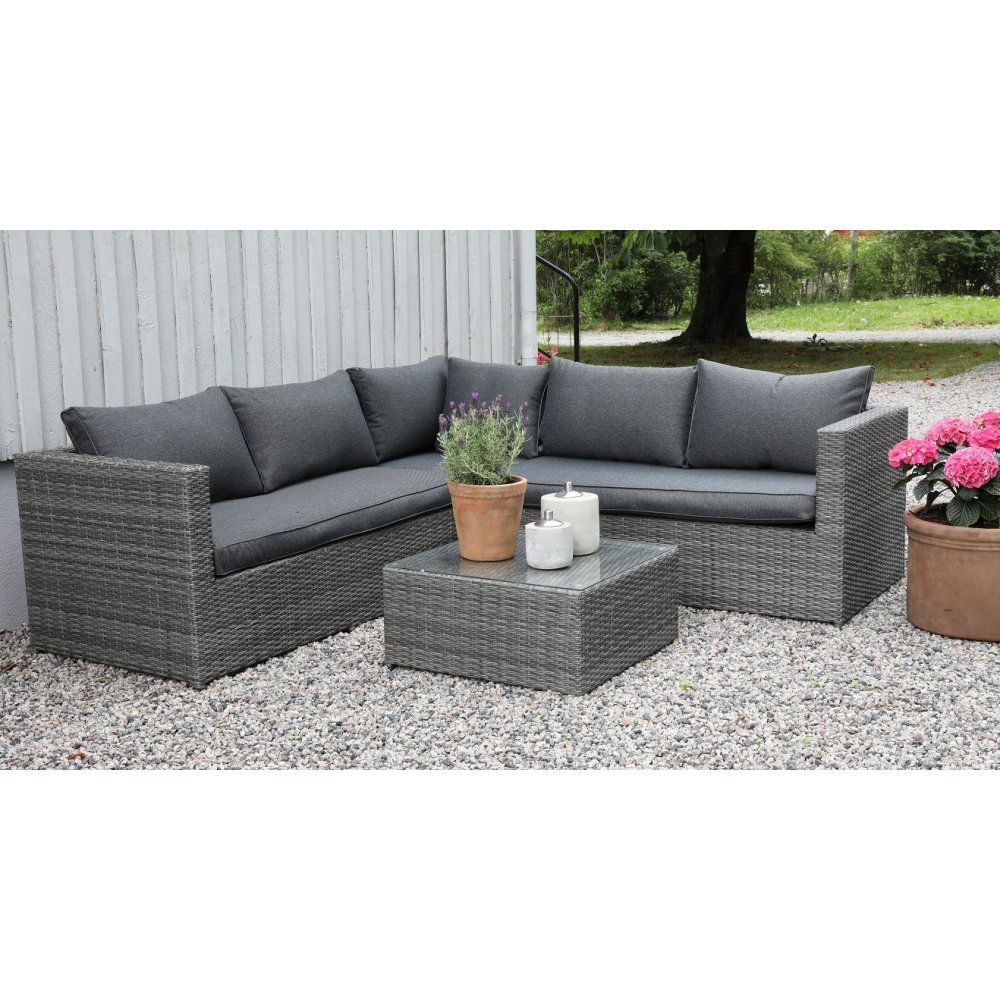 Miami er en klassisk møbelgruppe i mørkegrå kunstrotting, bestående av en hjørnesofa og bord. En værbestandig og holdbar utemøbelgruppe med ramme av aluminium, perfekt til uteplassen eller vinterhagen. Antrasittfargede komfortable puter av polyester er inkludert. Seteputer er i et stykke, for å unngå skjøter. Bordet har en topplate av herdet glass.