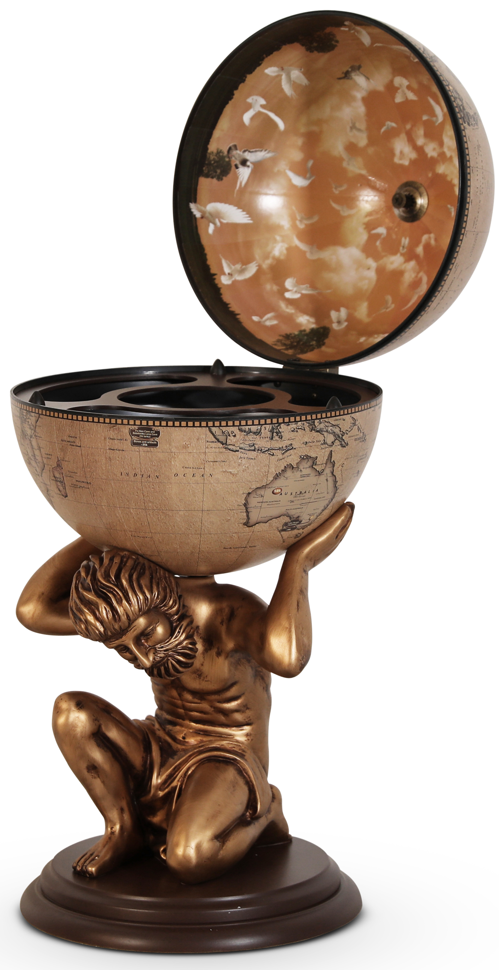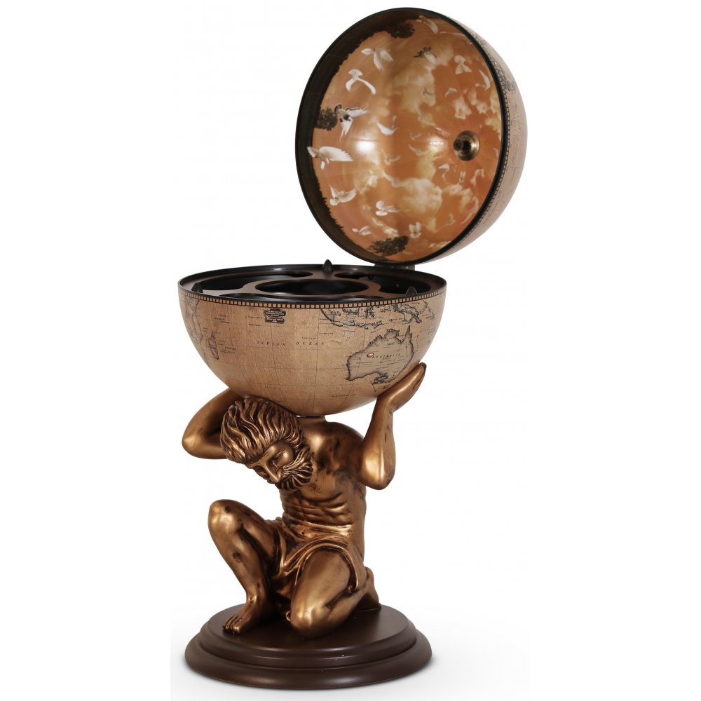 Barglobus stående på gullfarget stativ, vendt brun bunnplate. Plass til flasker og glass inne i barglobusen.