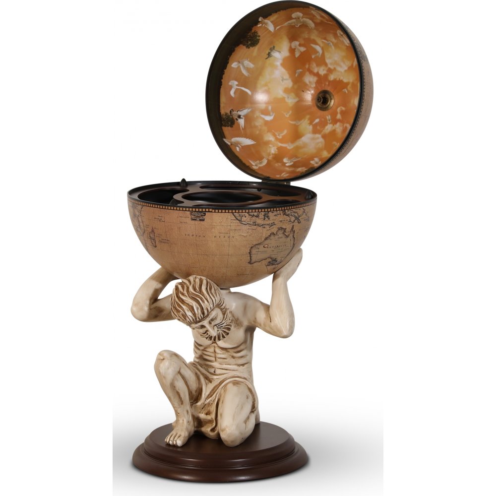 Barglobus stående på hvitt stativ, vendt svart bunnplate. Plass til flasker og den slags inne i barglobusen.