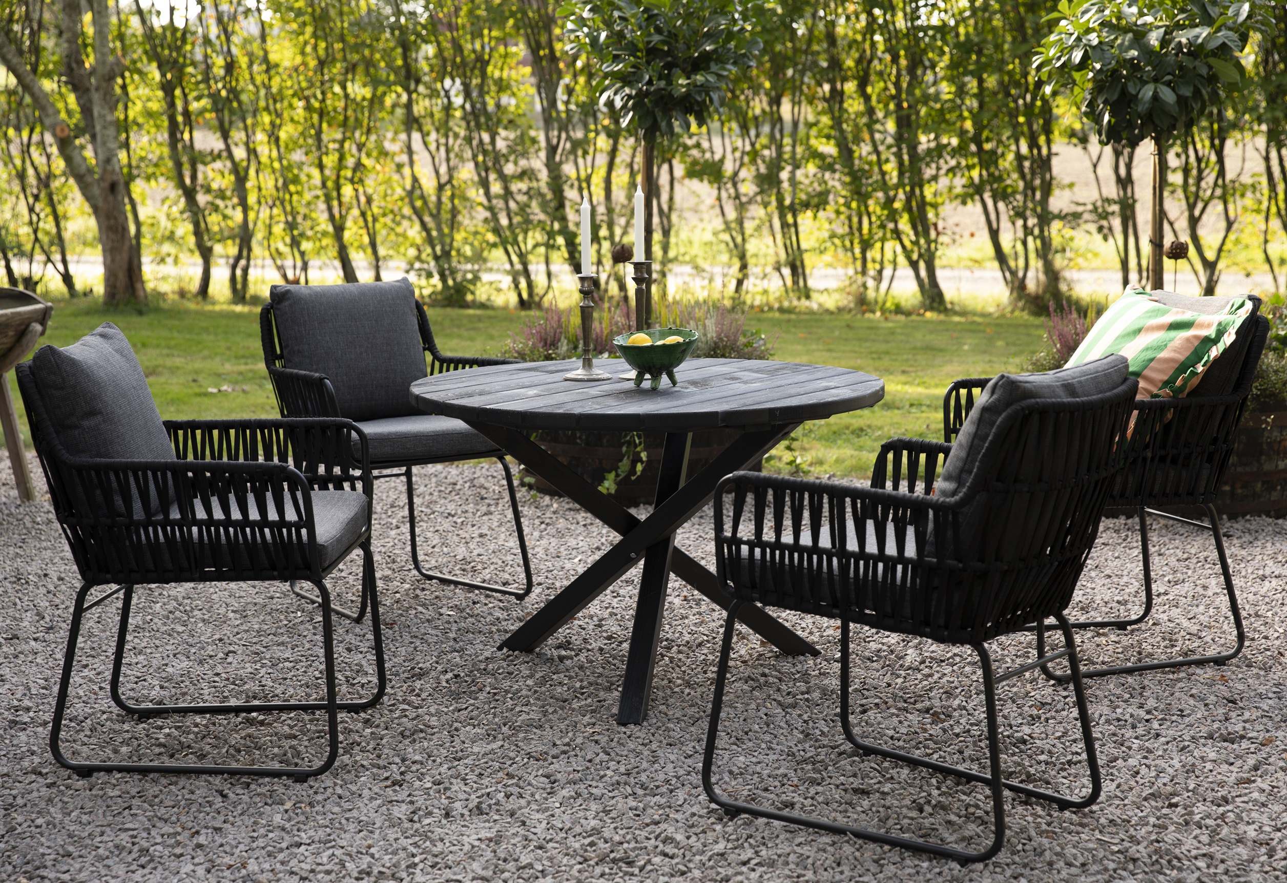 Mikado utegruppe: Scottsdale rundt svart spisebord Ø112 cm inkludert 4 Mikado svarte lenestoler med grå puter