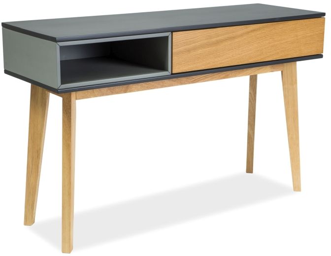 Et pent konsollbord med et moderne design. Bordet er laget av MDF med en nydelig naturlig finér og underdelen er av solid tre. Bordet er utstyrt med en praktisk hylle under bordplaten for smart oppbevaring av diverse saker og ting.
