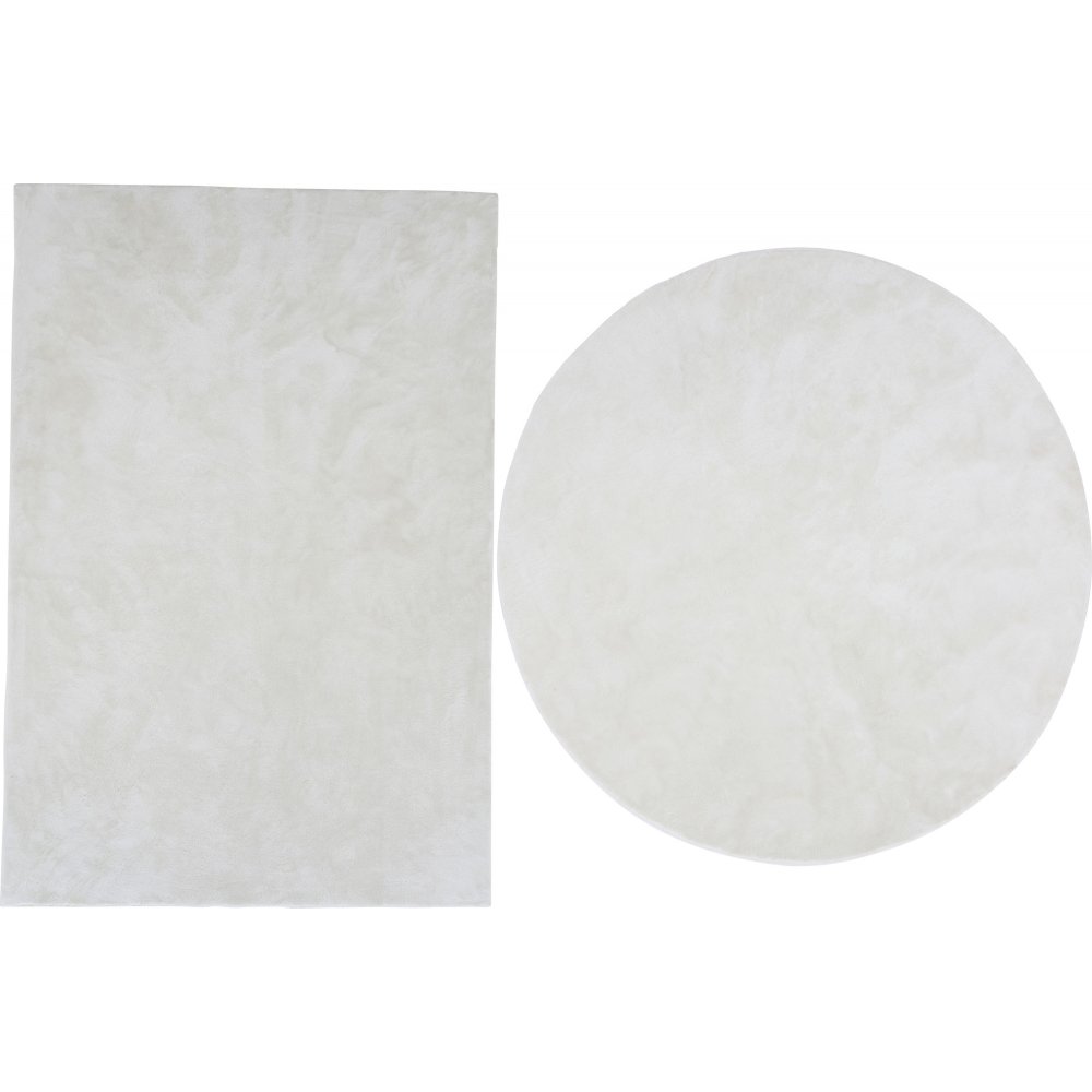 Polyesterteppe med silkeaktig følelse i moderne hvit fargetone med fine fargeskiftninger som gir teppet liv. Den runde formen og fargetonen gjør at den passer sammen med det meste.