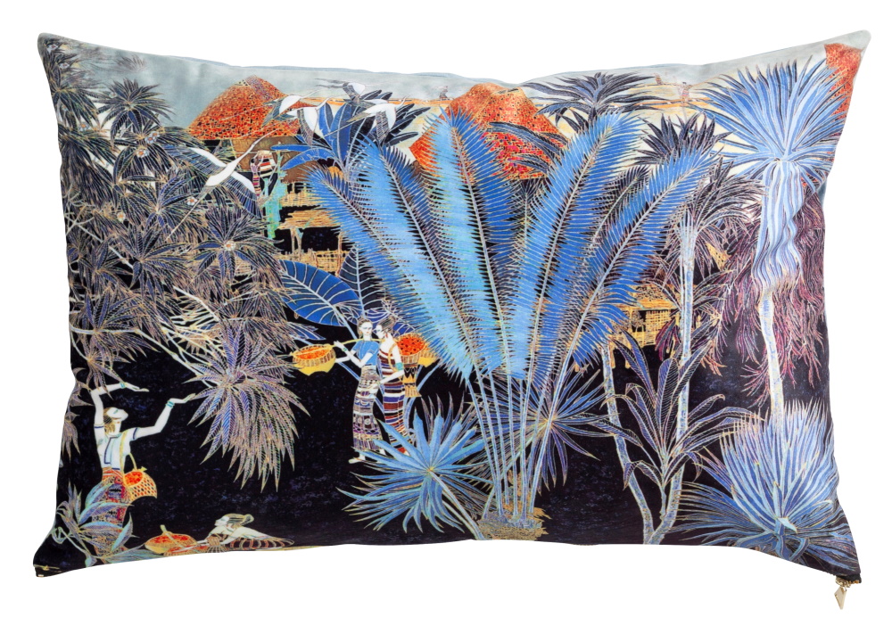 Pent putetrekk i fløyel med vakkert trykk på fremsiden og ensfarget bakside. Gullfarget glidelås i bunn.