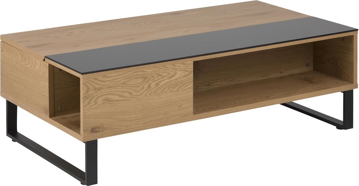Et stilig og praktisk sofabord med smart oppbevaring. En hylle på siden for oppbevaring av for eksempel aviser og et oppbevaringsrom under en plate som lett åpnes og lukkes. Bordet er i eik med en sort glassplate og sorte metallben.