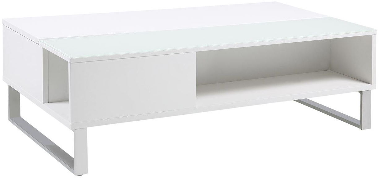 Et stilig og praktisk sofabord med smart oppbevaring. En hylle på siden for oppbevaring av for eksempel aviser og et oppbevaringsrom under en plate som enkelt åpnes og stenges.
