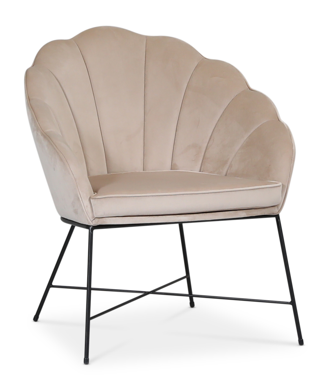 Lenestolen Mirò er en pen, stilren og vakker lenestol, kledd i et nydelig beige fløyelsstoff. Ryggen ser ut som et skjell. Svartlakkerte metall ben.