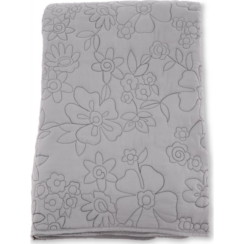 Sengeteppe laget av mikrofiber som gir sengen et mykt og føyelig inntrykk. Dekorative sømmer i blomstermønster.