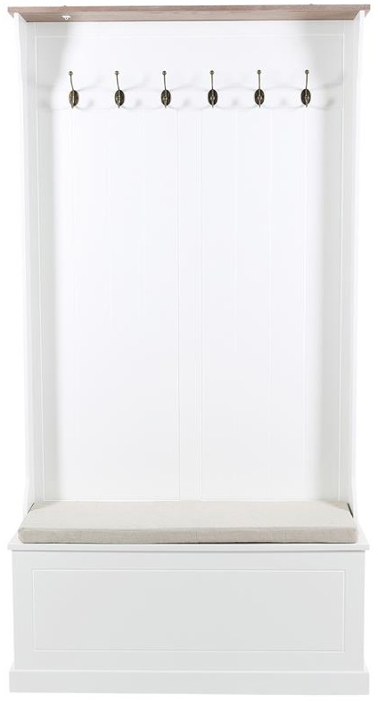En fin og praktisk kleshenger fra vår Missouri-serie. hvitlakkert farge, praktisk benk med oppbevaring, 6 stk kroker og en hattehylle. perfekt møbel til gangen.