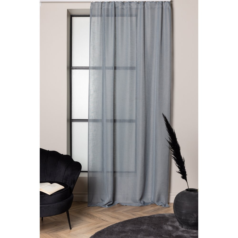 Gardinlengde i grå farge med et florlett stoff laget av polyester.