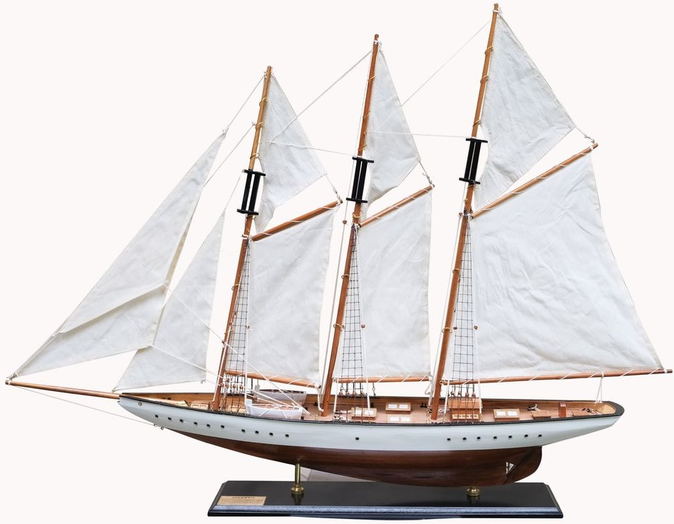 Modell av en flott seilbåt med store seil. Båten er av massiv brunmalt furu. Segl håndsydde av bomull.