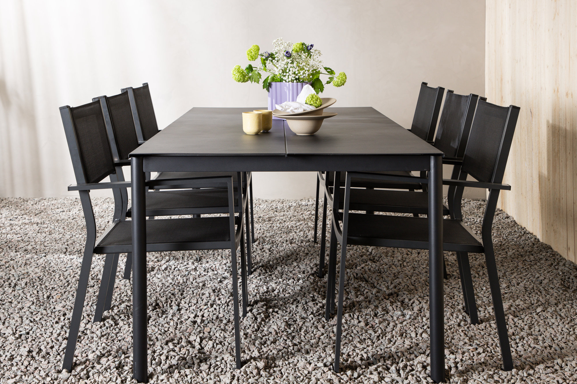 Stilig, smart og slitesterkt spisestuesett som tåler tidens tann! Modena er vårt populære spisebord i rette nordiske former som har plass til mange mennesker. Bordet har en rektangulær bordplate i sort aluminium og sylindriske ben i minimalistisk stukk. Her i en deilig kombinasjon med våre populære Copacabana spisestuestoler i sort tekstilene. Møbler uteplassen innbydende og komfortabelt!