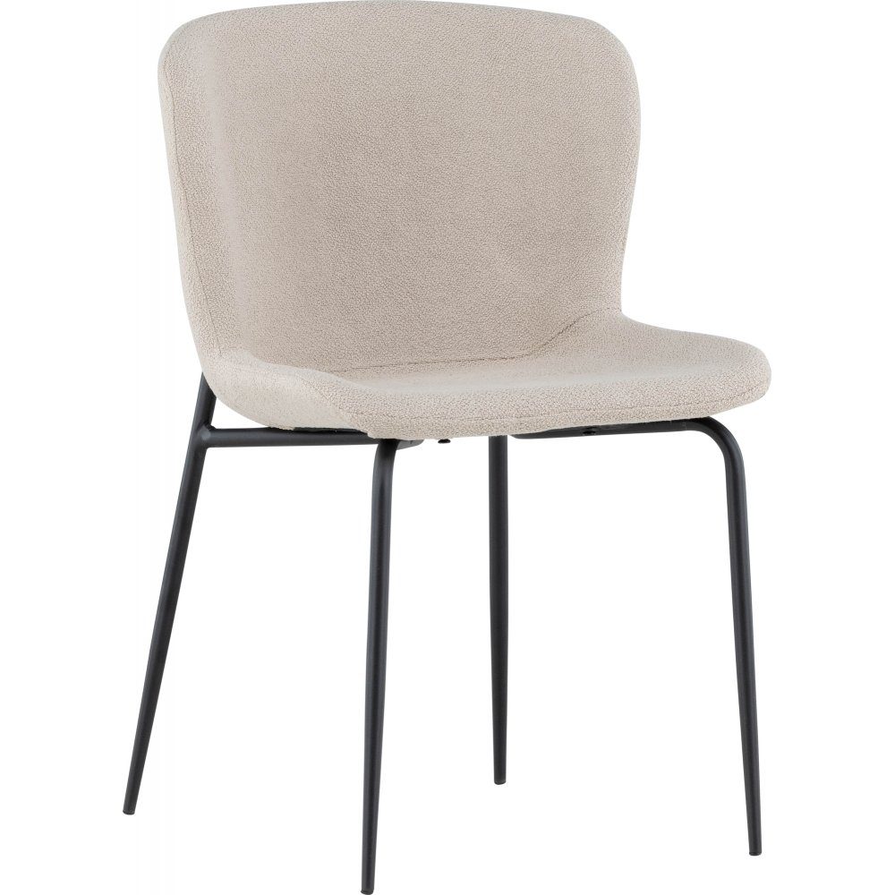 Spisestol som er like trendy som komfortabel. Skap en innbydende atmosfære i hjertet av hjemmet med denne myke spisestuestolen i skandinavisk design. Stolen er helt dekket i beige shaggy bouclé-stoff med stilige slanke stolben i sort metall. Den lett avrundede ryggen og polstret setepute gir ekstra komfort og utvider hyggelige måltider rundt spisebordet.