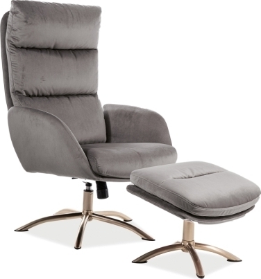 Lenestol av metall og børstet stål. Polstret med polyesterstoff i fløyelsimitasjon. Fotskammel inkludert.