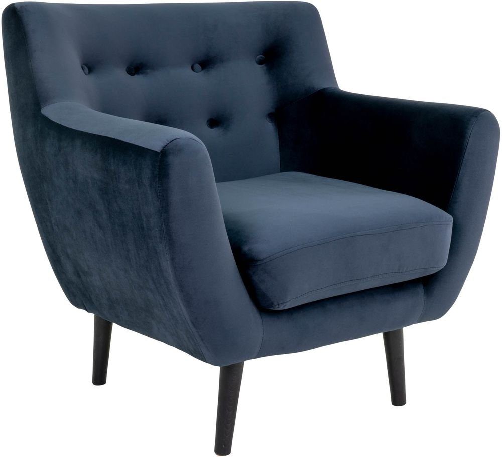 Lenestol i mørk blå velur med svarte ben.