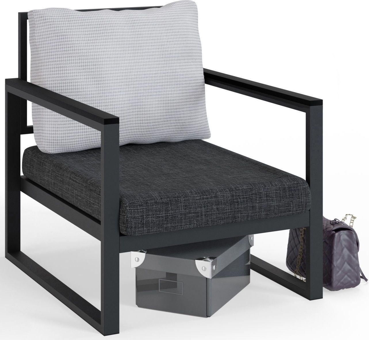 Lenestol laget av metall og polyuretanplast. Trukket med akrylstoff.