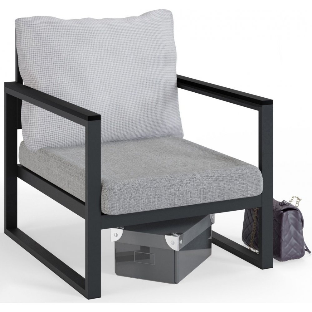 Lenestol laget av metall og polyuretanplast. Trukket med akrylstoff.