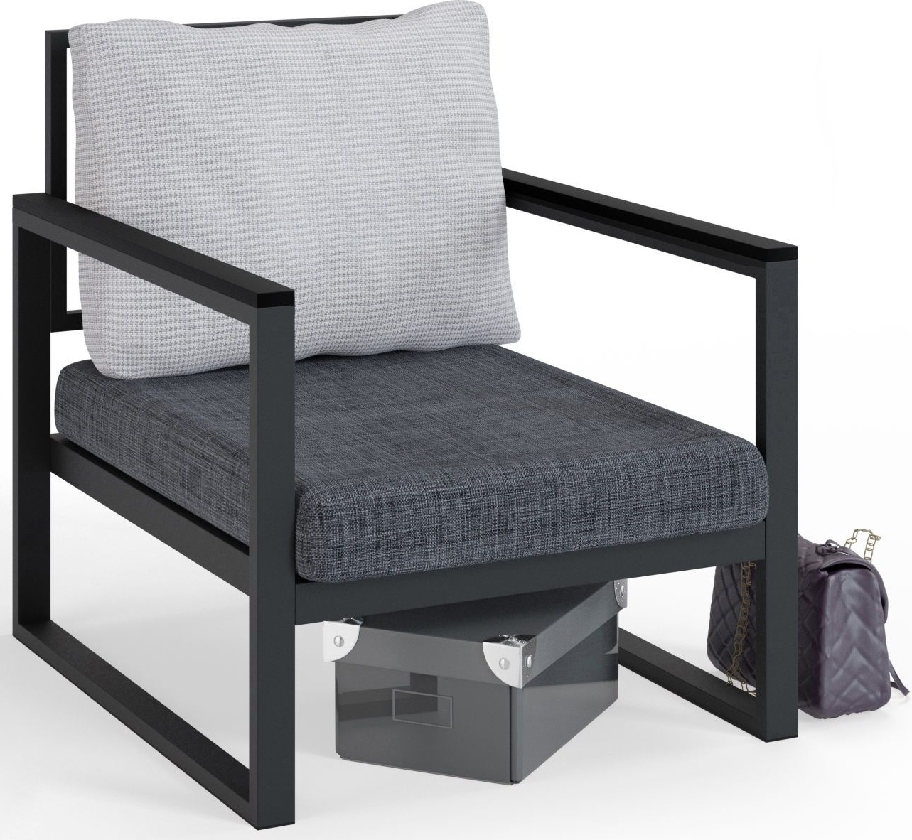 Lenestol laget av metall og polyuretanplast. Trukket med akrylstoff.