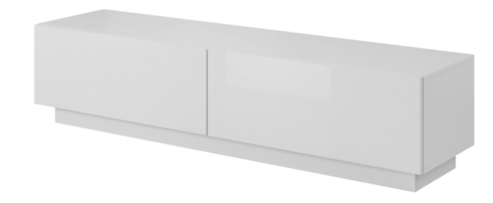En stilig multimediabenk med et moderne design. Produsert i hvitlakkert MFP (premium treplate) og sponplater, med to skap med front i hvit høyglans og smart Push-klikk-funksjon på døren. Benken passer perfekt inn i hjemmet og lar seg enkelt kombinere med en sofagruppe.