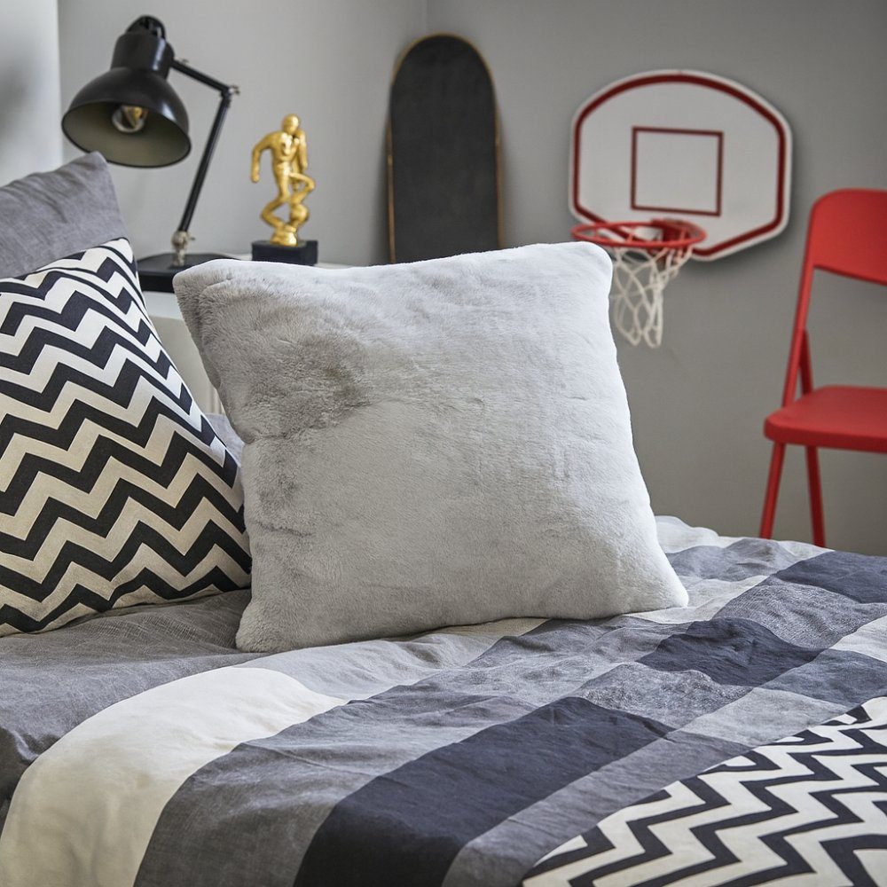 Mykt putetrekk i lys grått pelslignende materiale, 100 % polyester.