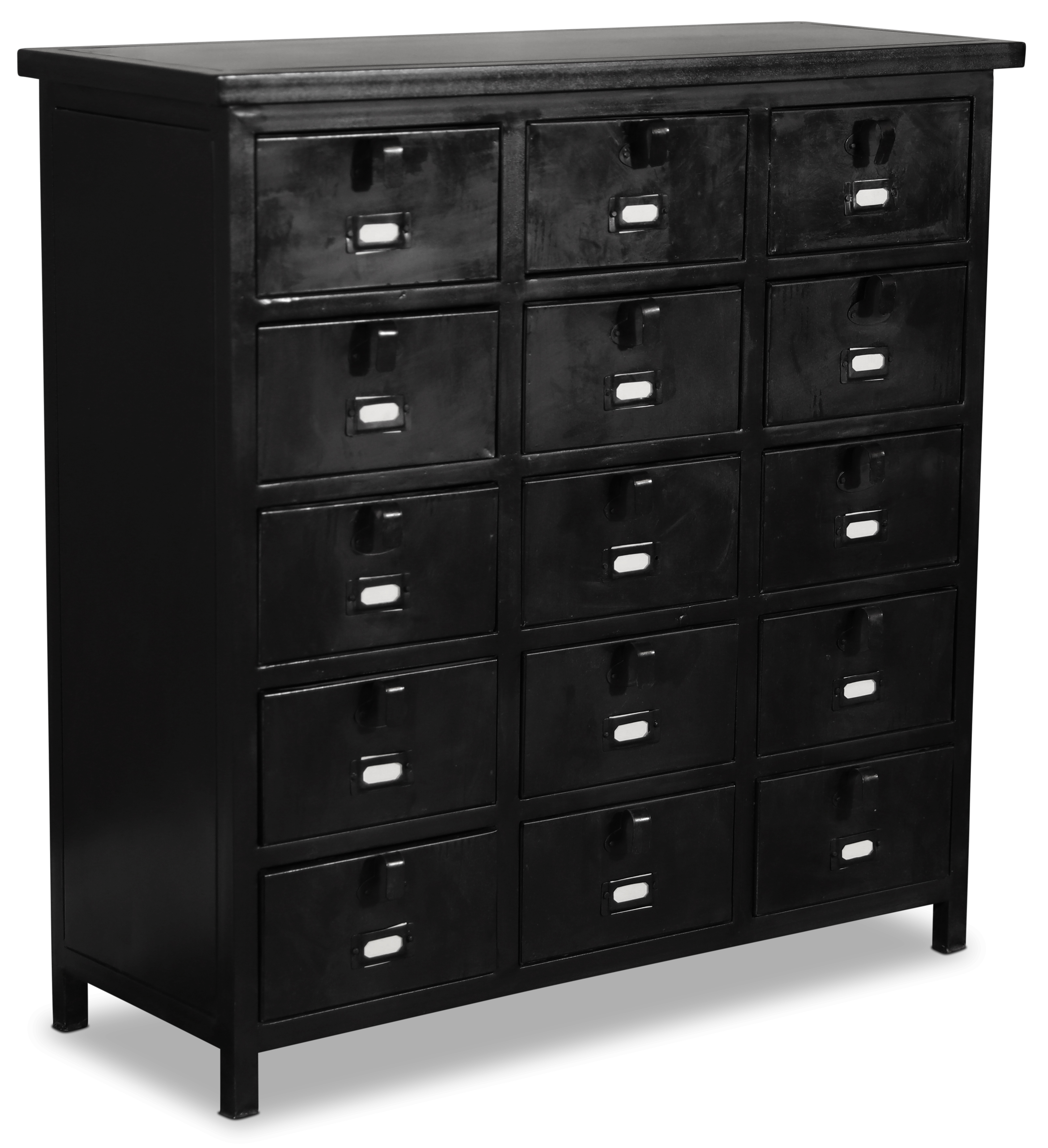 Kommode i helt svart metall med 15 mindre skuffer. Svarta håndtak. Dette møbelet er i industriell stil.