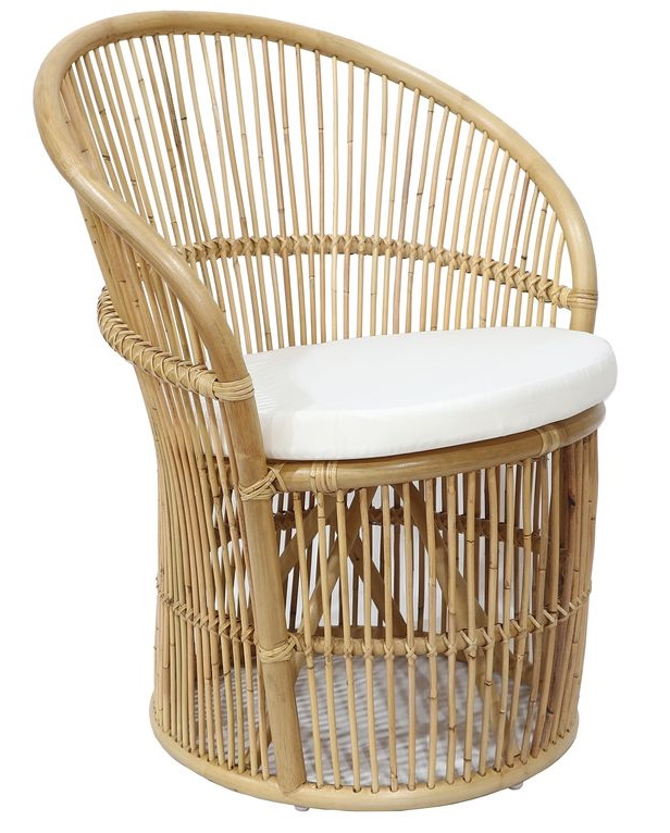 Narva-serien med originale og futuristiske lenestoler, laget av rotting av forskjellig farge med en kremhvit setepute.