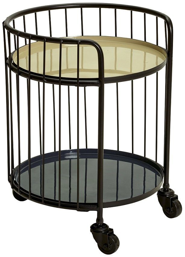 En tradisjonell serveringsvogn med et vintage design. Laget i oksidert metall. Underhyllen er i blå emaljering mens overhyllen er i beige emaljering. Denne serveringsvognen er beregnet som dekorasjon og bør maks belastes med en vekt på 30 kg.