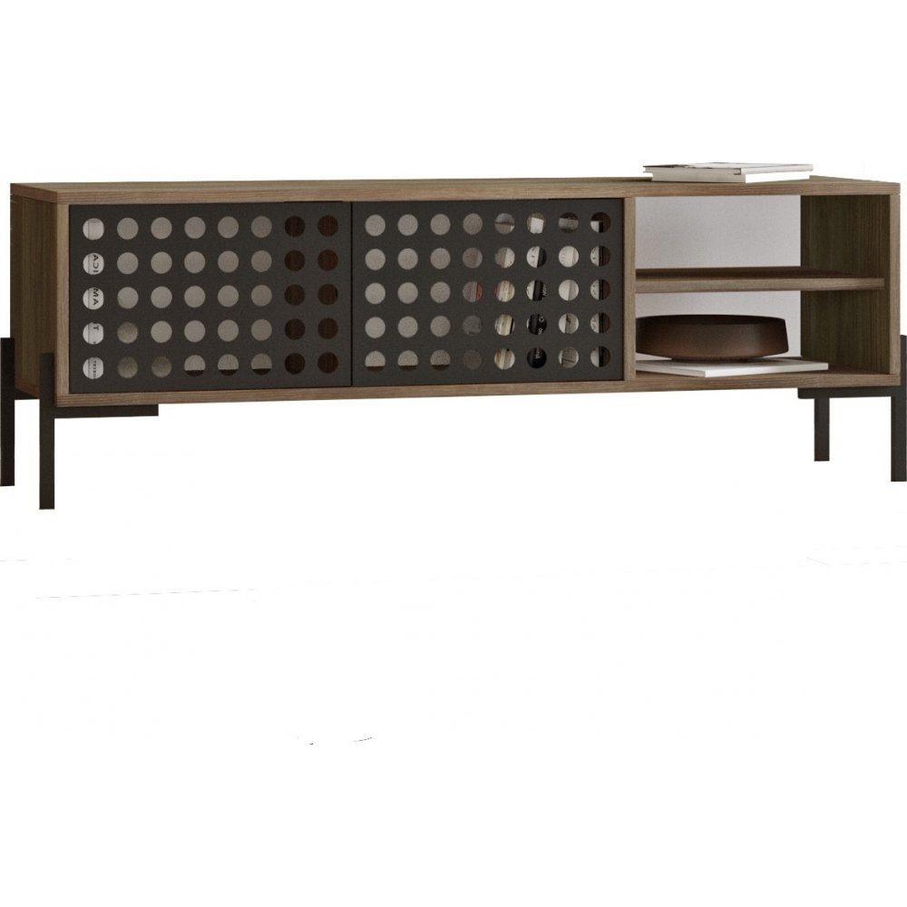Mediebenk laget av tre og metall.