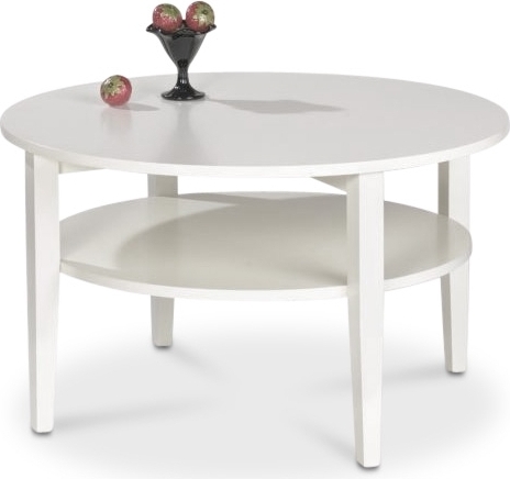 Nevada er et lite rundt salongbord i hvitlakkert MDF med nedre hylle for ekstra oppbevaringsplass.