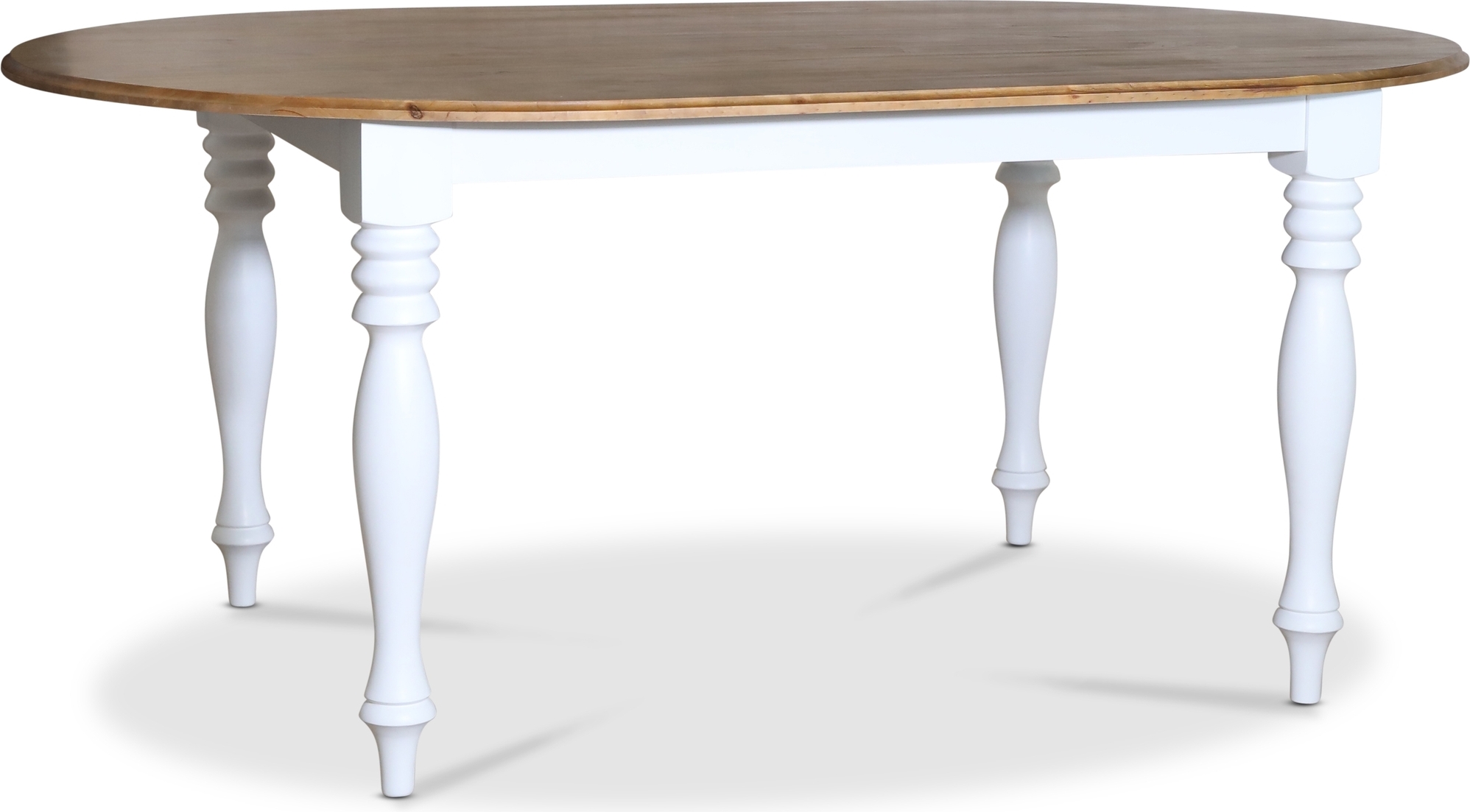 New England spisebord i klassisk stil. Bordet er robust i massiv furu med hvite ben. Det settes preg på hvert eksemplar, da skiven er vokset for hånd, noe som fremhever treets naturlige årringer. Hvert bord er unikt.