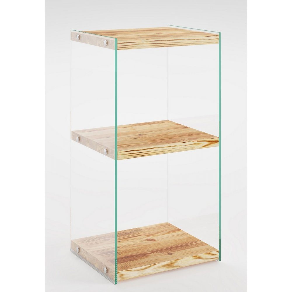 Bokhylle laget av furu og herdet glass. Maks vekt: 10 kg/hylle.
