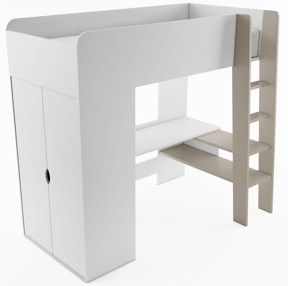 Opp til sengen har man en stødig og kraftig stige, som også er koblet til skrivebordet som er under sengen. To av trappetrinnene er forlenget og fungerer som oppbevaringshyller til skrivebordet. På dene enden har du også en romslig to-dørs garderobe med kleshenger og hylleplan. Et perfekt multimøbel til barn.