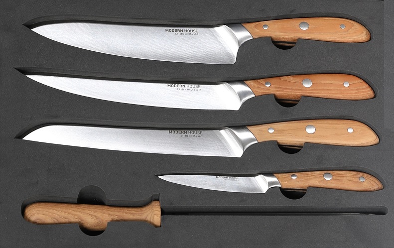 North høykvalitativt knivsett for den rutinerte kokken. Knivsettet består av 4 stk. kniver med lengdene: L34 cm, L20 cm, L20 cm og L10 cm samt et stål. Eksklusive håndtak av massivt tre. Tysk rustfritt stål herdet til hardhet 56.