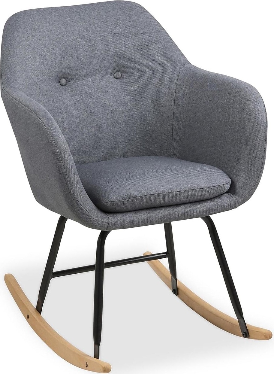 Gyngestol med en klassisk profil. Kledd i mørkegrått tøystoff, beina er av svartmalt metall og bena er av lakkert bøk tre. Stolen inngår i vår Oceanside serie.