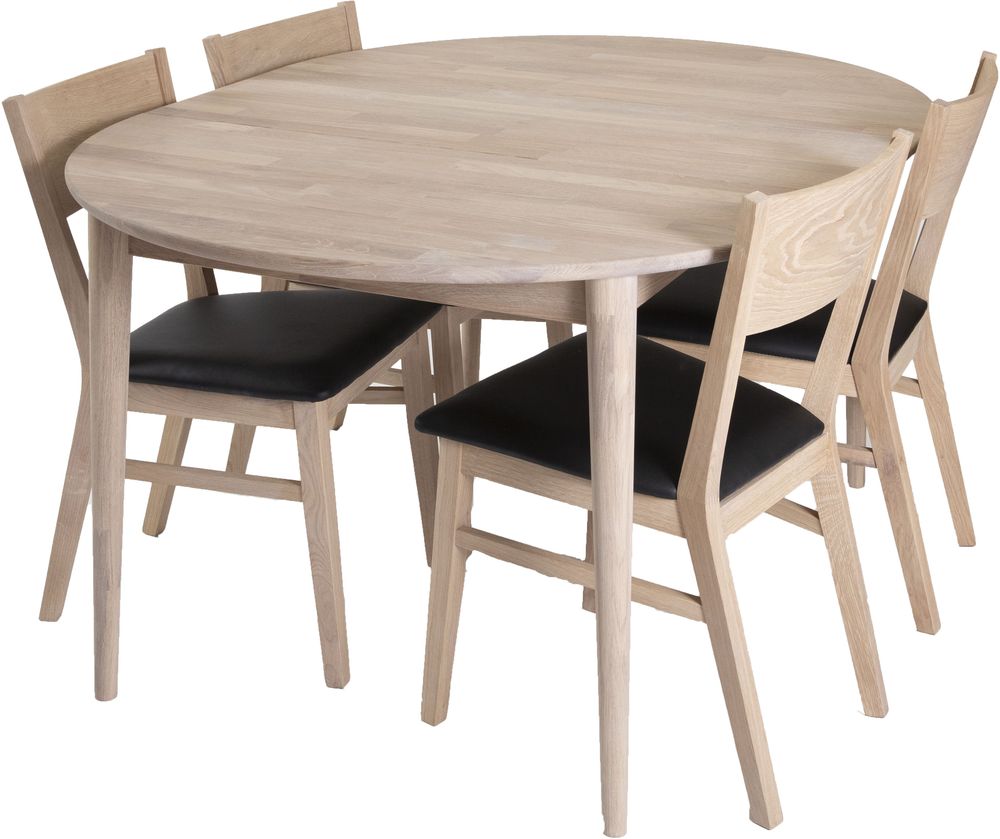 Spisegruppe med bord av massiv hvitoljet eik med runde ben. Inkludert er også matchende stoler i hvitoljet eik og sete av svart PU.