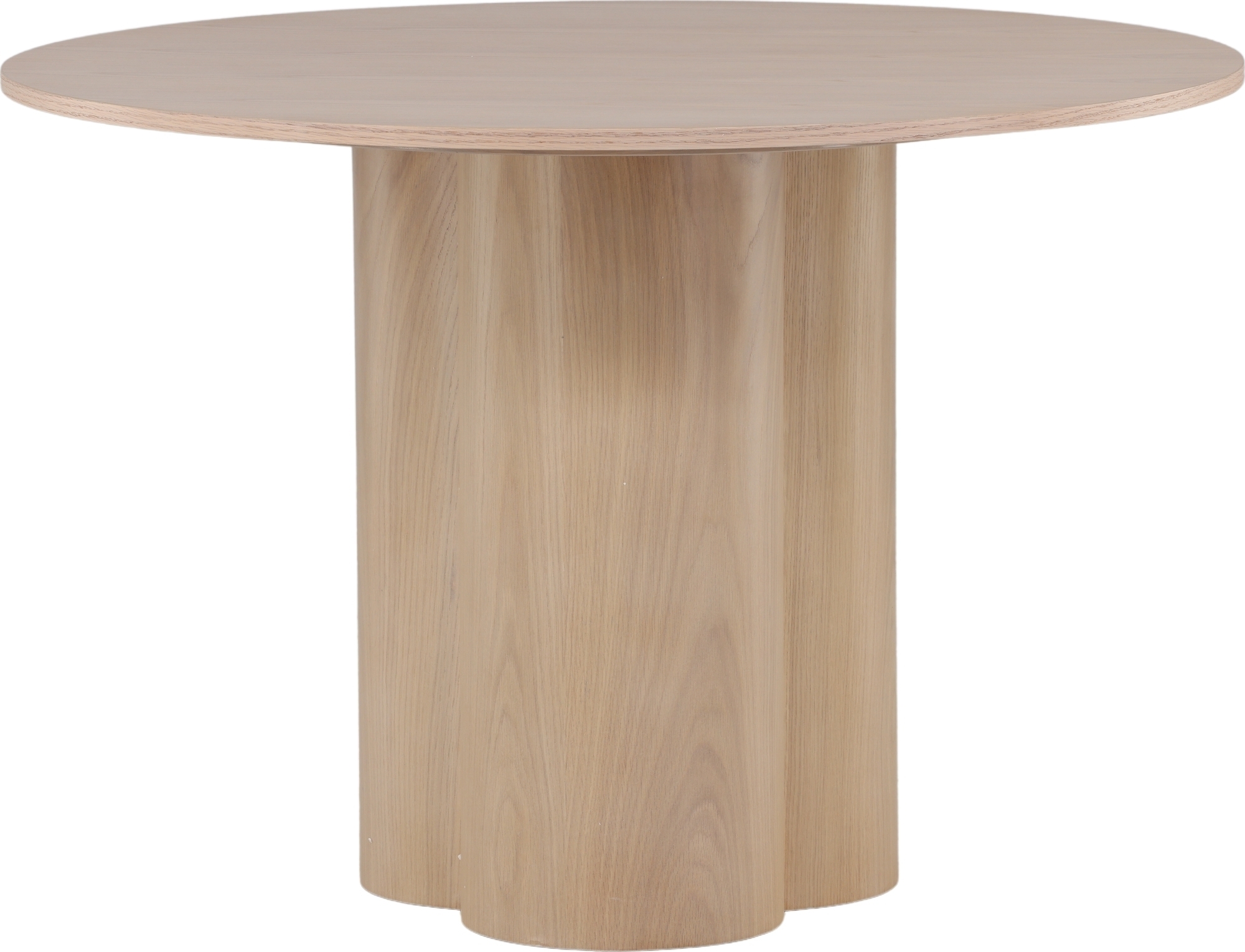 Spisebord med skandinavisk design og smakfullt design. Bordet har en gjennomgående helhetsdesign i hvitpusset MDF med en tynn, rund topplate og tre sylinderformede ben som sitter sammen under midten av bordet. Det tynne fargelaget synliggjør mønsteret på materialet og gir liv og bevegelse til bordet. Skap et stilig blikkfang i hjertet av hjemmet der ingen havner på kanten.