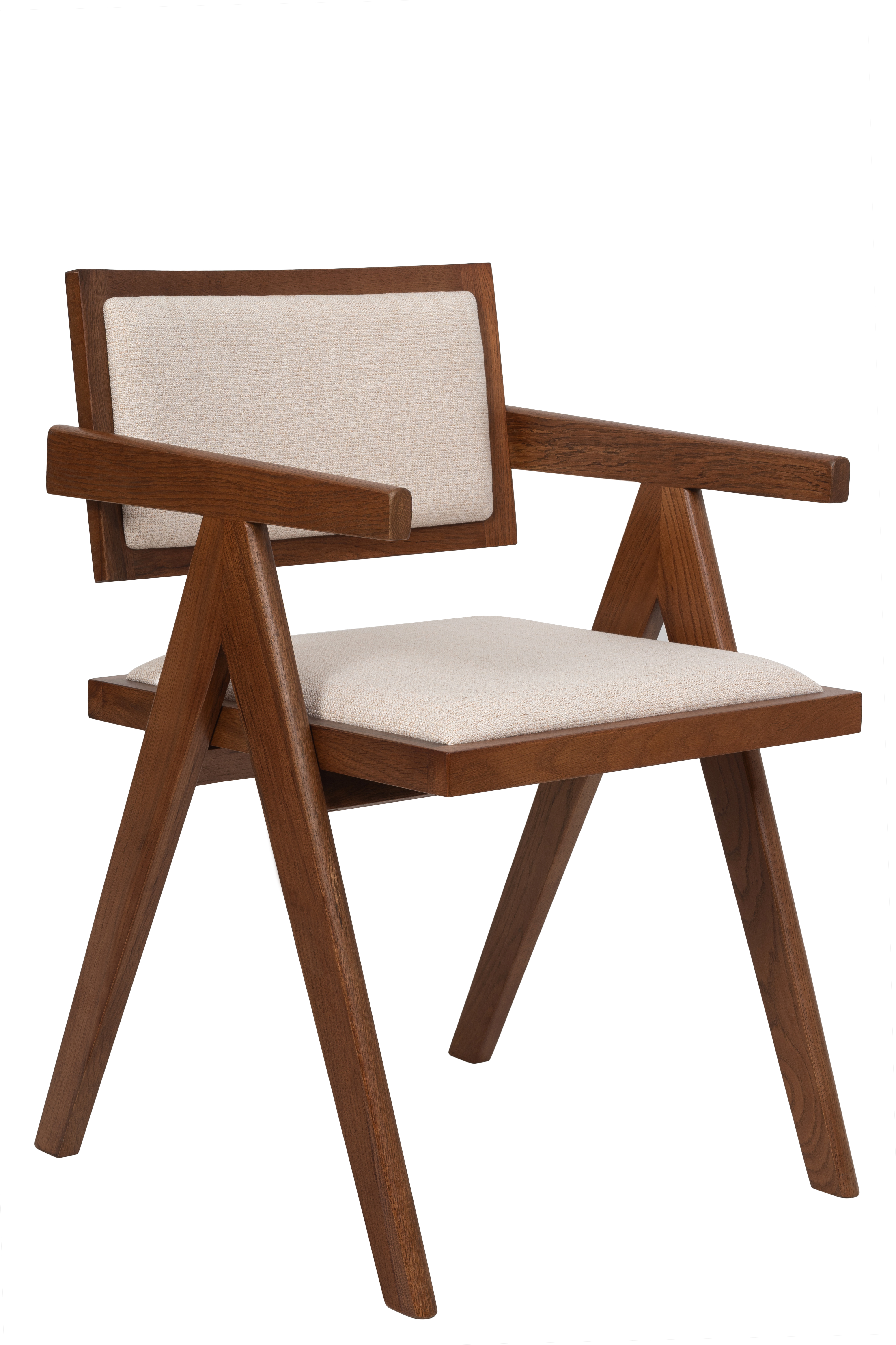 De to Sara-lenestolene kompletterer bordet med sitt tidløse design og komfortable sitteplasser. Stolene har en ramme laget av FSC-sertifisert heltre eik med en valnøttfarget overflate, mens setet og ryggen er trukket i et mykt linfarget stoff. Kombinasjonen av tre og tekstil skaper et harmonisk uttrykk som gjør spisegruppen både varm og innbydende.