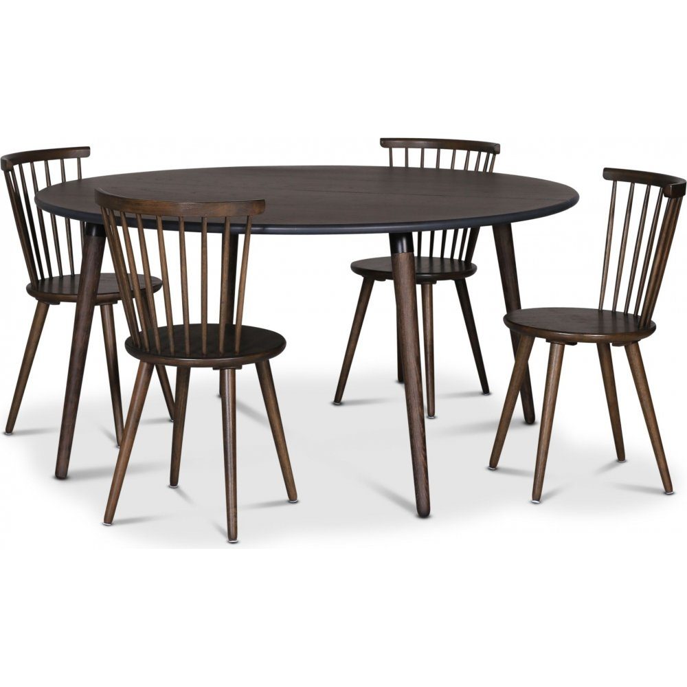 Spisegruppen inneholder Omni spisebord, en serie med runde spisebord med topplate av eikefiner i forskjellig utførelse med matchende ben. Et stilrent og nett spisebord. Det følger også med 4 stk. Castor pinnestoler, en klassisk pinnestol i velkjent design. Castor står for ekte håndverk med høy kvalitet i produksjon og valg av materialer. Utførelse Smoked wood (mørk brun).