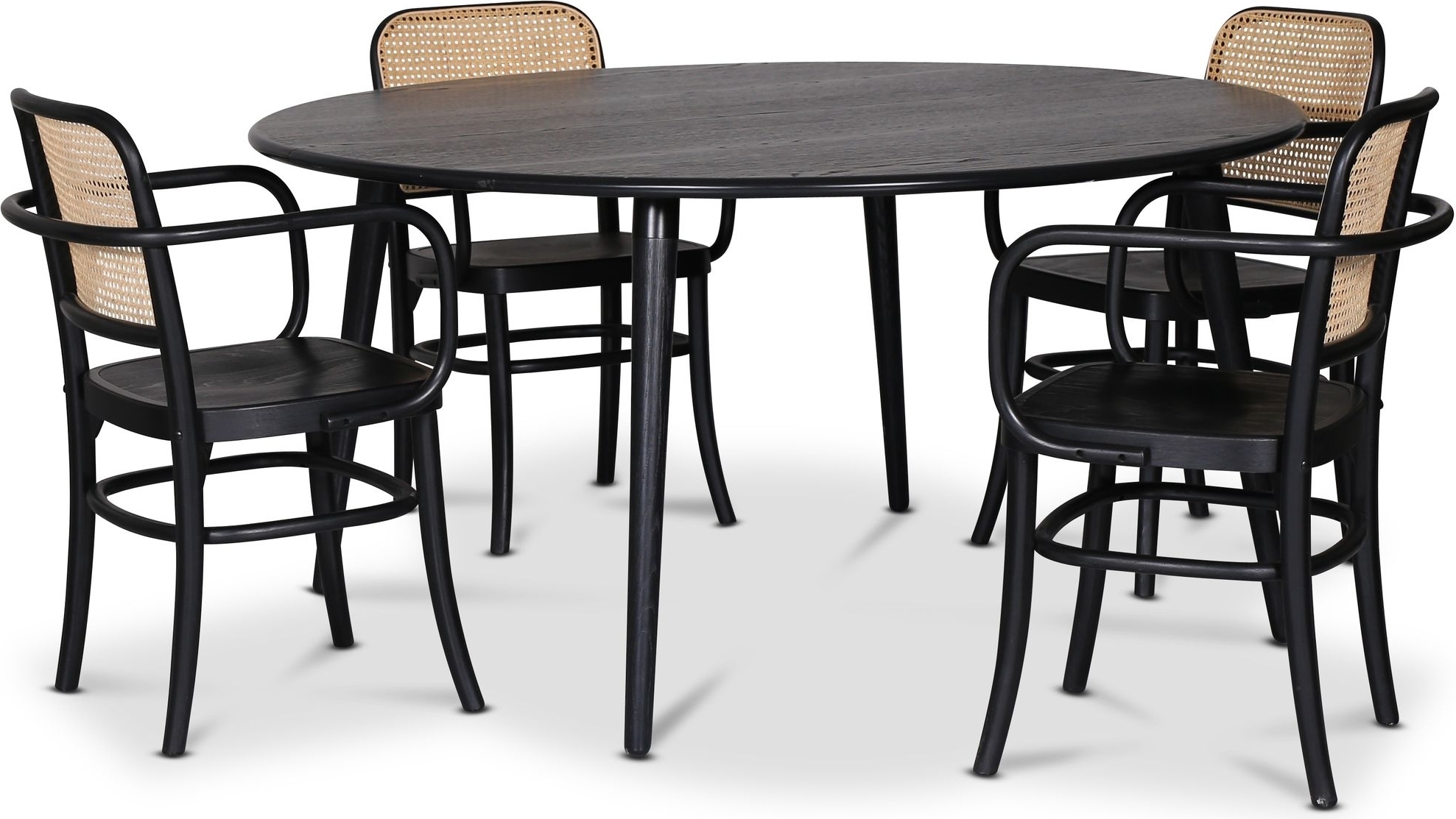 Spisegruppen inneholder Omni spisebord, en serie med runde spisebord med topplate av eikefiner i forskjellig utførelse med matchende ben. Et stilrent og nett spisebord. Det følger også med 4 stk. Nemis karmstoler med svart ramme i bøyd tre, laget av bøk. Sete i tre og ryggstøtte i naturlig rotting.