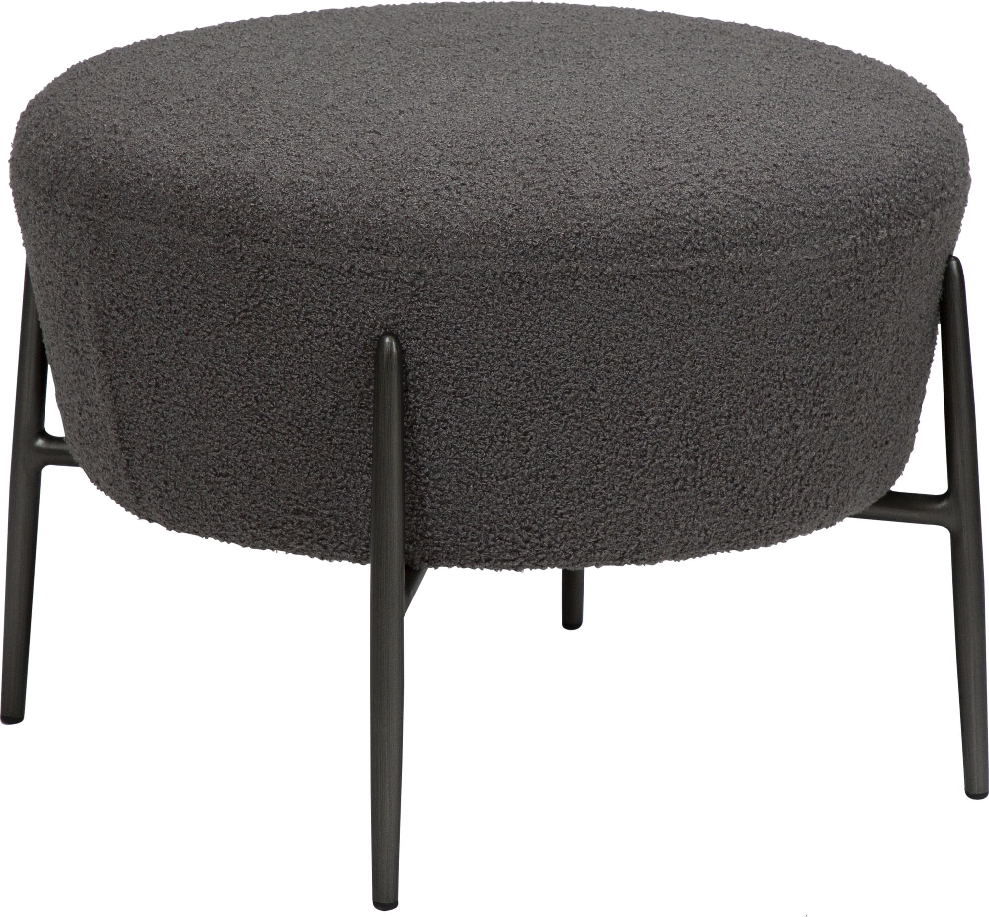 Fotskammel/krakk med et særegent og luksuriøst utseende. Den har en rund, polstret sitteflate dekket med mykt boucléstoff. Sammen med de smale, lett avsmalnende bena uttrykker krakken en sofistikert eleganse.