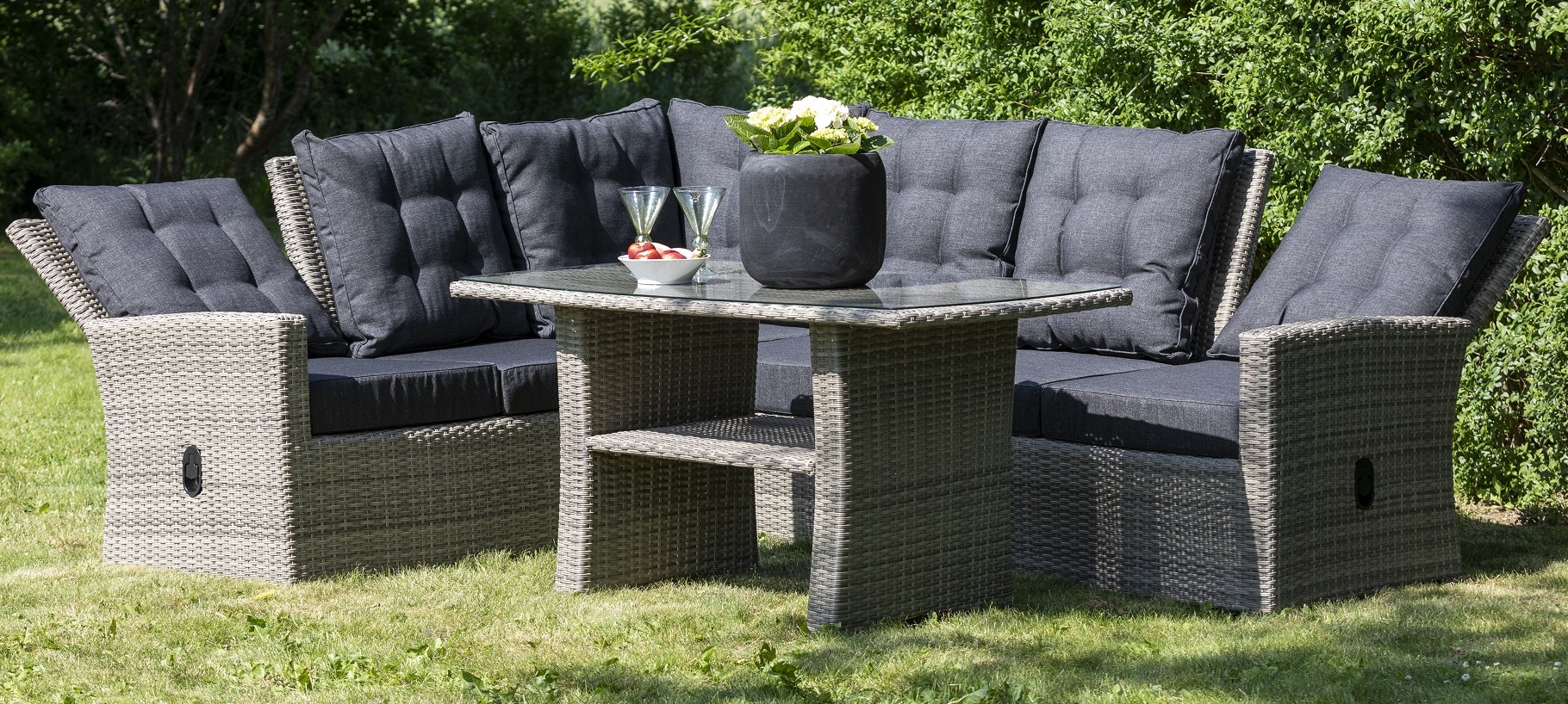 Orlando gir deg en utemøbelgruppe i klassisk kunstrotting i gråmelert dobbeltvevd halvrund rotting. Møbelgruppen består av spisebord med en stor hjørnesofa med justerbar rygg på høyre og venstre yttersete. Materialene er en holdbar aluminiumsramme som tåler utemiljøet. Bord med topplate i holdbart herdet glass for enkel rengjøring. Høy rygg og justerbare ytterseter for best mulig komfort.