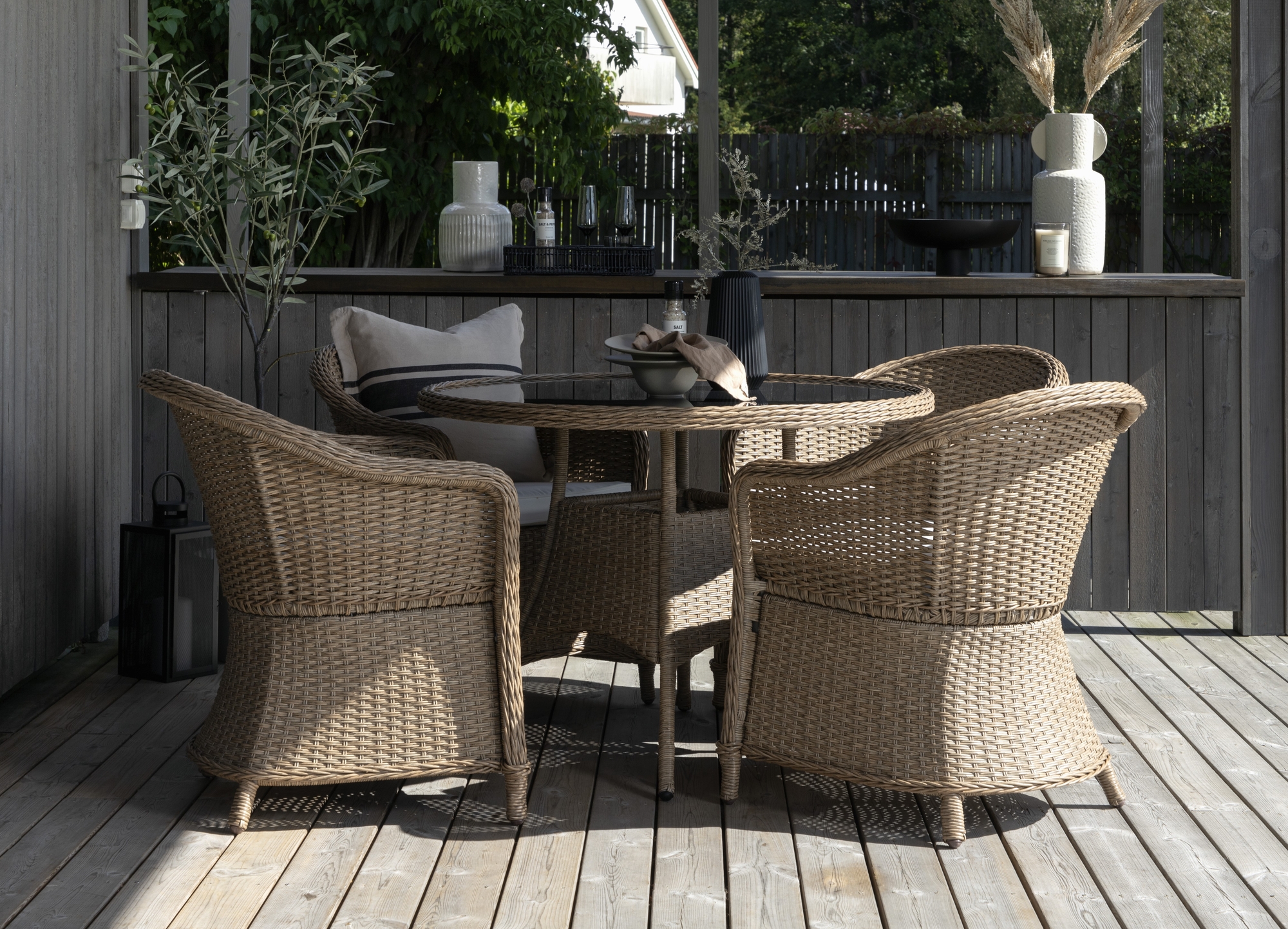 Spisegruppe i kunstrotting med et koselig og kjent preg. Samle familien til en solrik sommerlunsj i de komfortable stolene og dekk bordet på det vakre spisebordet med glassbordplate.