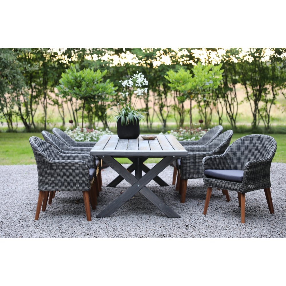 Oxford utendørs spisegruppe: grått bord 220 cm, inkludert 6 stk. Valetta lenestoler i grå kunstrotting