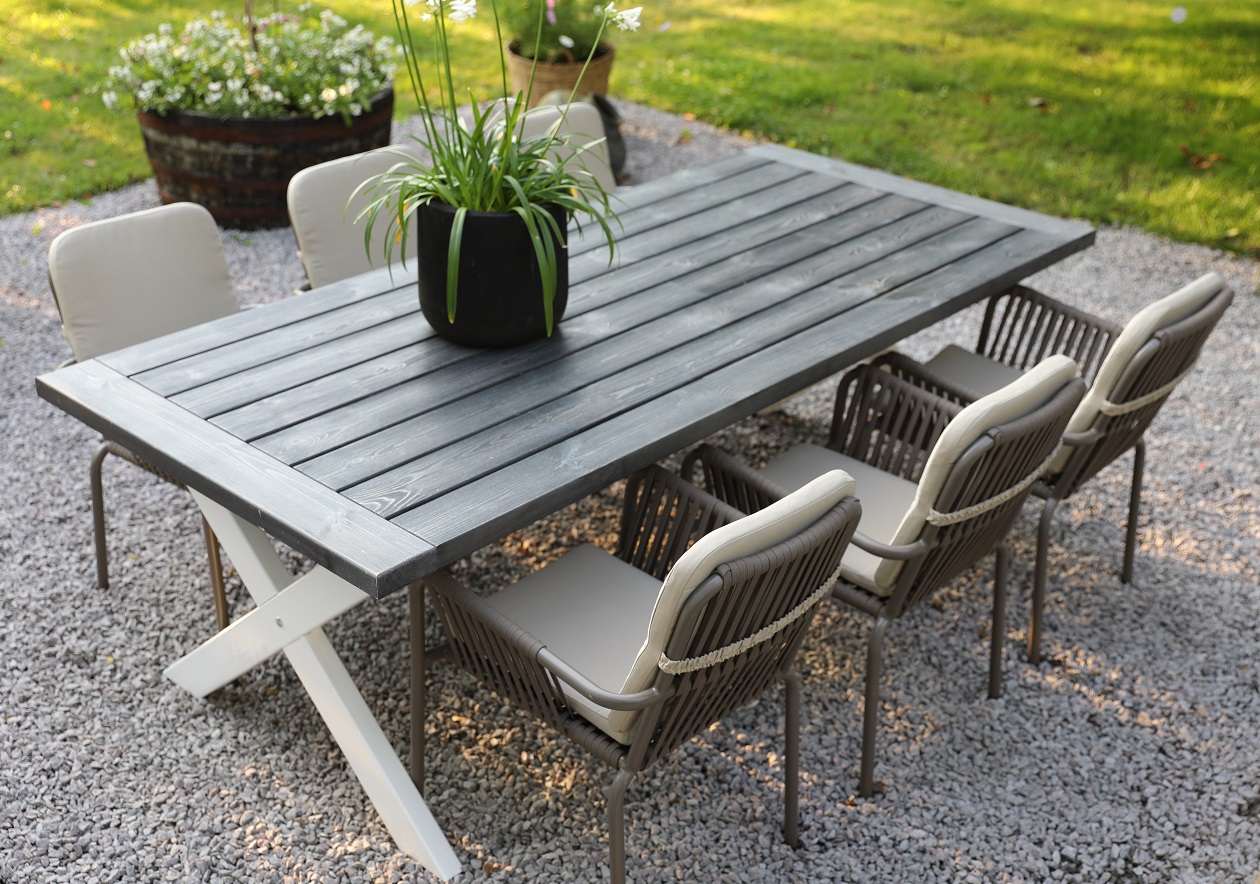 Spisegruppe som inneholder spisebord med grålasert topplate i furu med kryssben i hvittlakkert tre. Bordet har kryssben og bordplate av plank, noe som gir et robust og karakteristisk utseende.