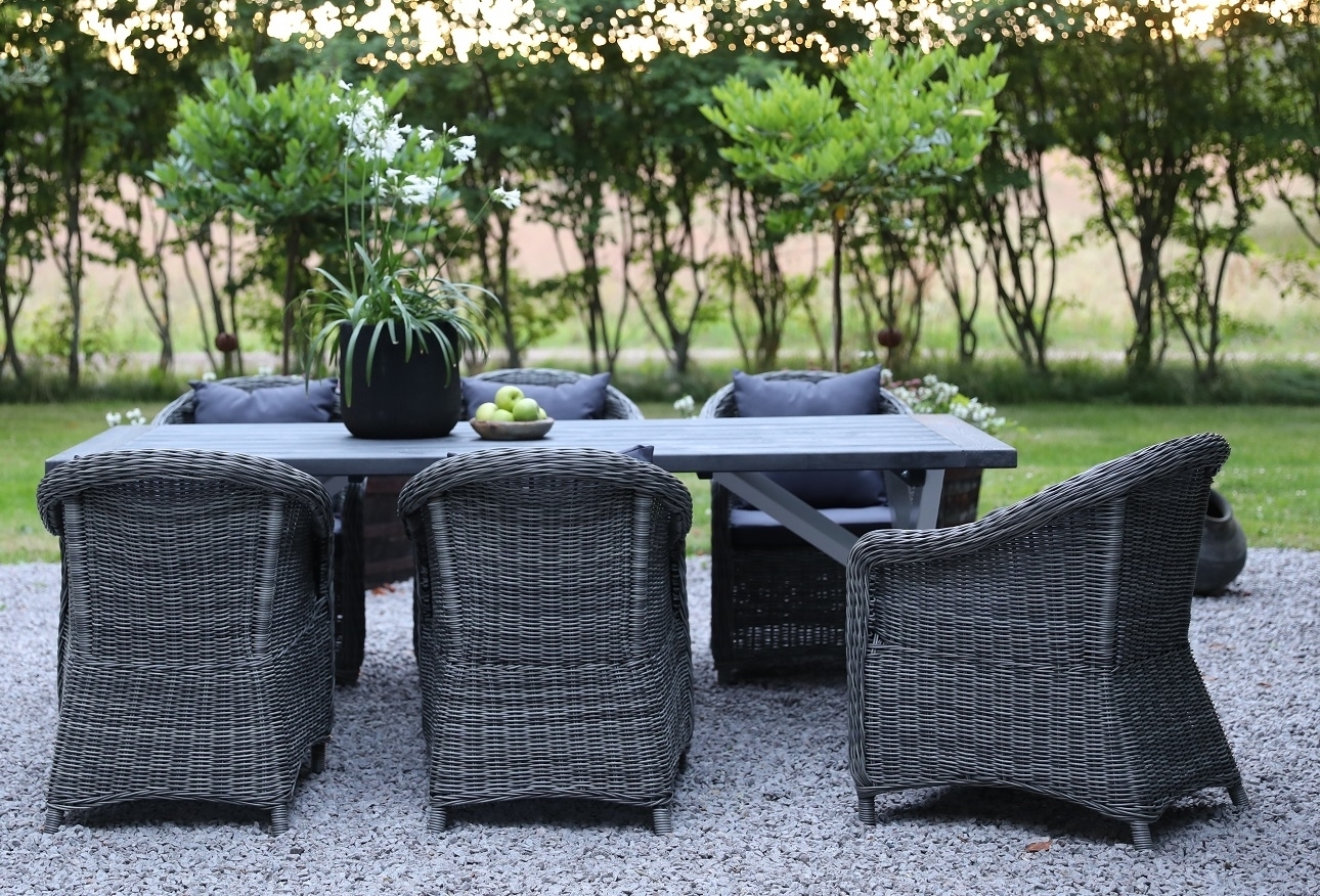 Inkludert 6 stk. Mercury lenestoler i matchende grå kunstrotting med setepute og ryggpute for best mulig komfort. Spisegruppen passer perfekt på balkongen, terrassen og i uterommet.