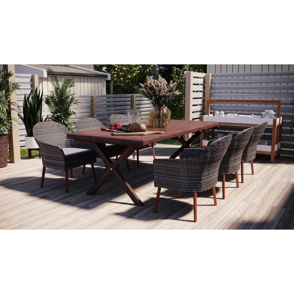 Spisegruppe som inneholder stort og solid spisebord i brunbeiset tre med kryssben og bordplate av plank. Et kraftig spisebord som passer for litt større terrasser og uteplasser.