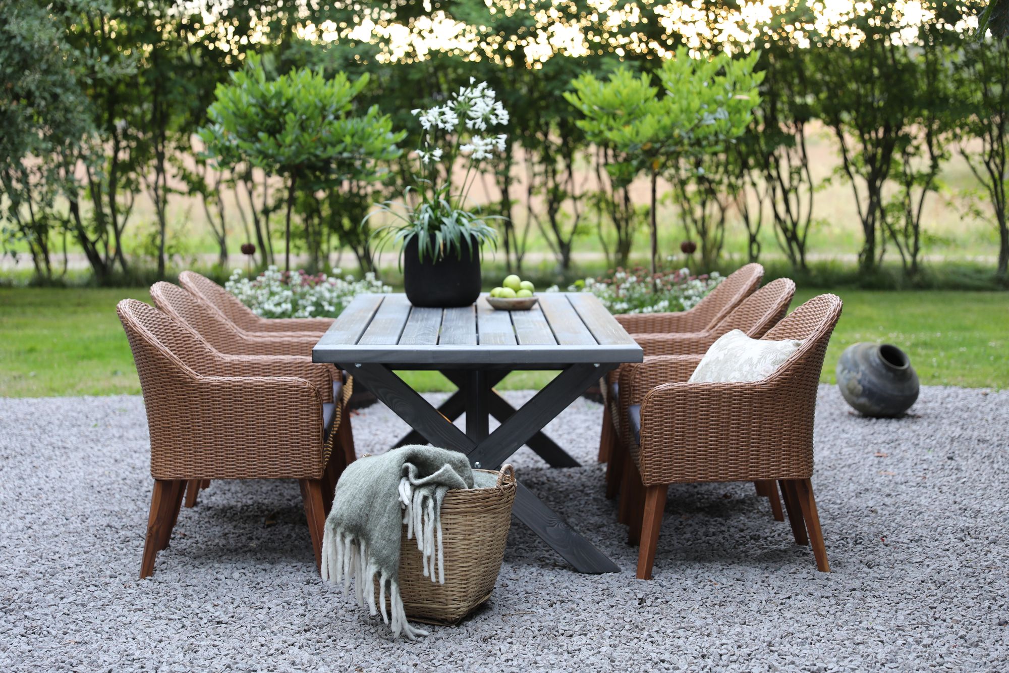 Inkludert 6 Valetta stoler i naturfarget rotting med brune ben fra Skånska Möbelhuset. Lenestolen har mørk grå setepute.
